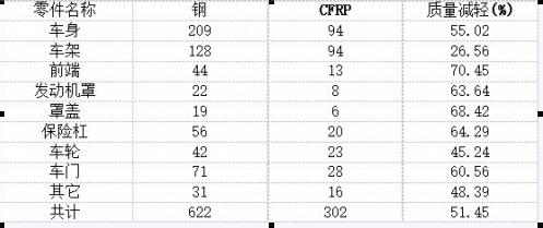 有研究表明:總重量1550千克的新能源汽車續(xù)航里程186公里,如果總重量能減少到1011千克,則續(xù)航里程可提高到275.5公里。我們常見的車體是用鋼板制成的,但是它的質(zhì)量一般較重,而碳纖維正是一種輕量化的材料,它的密度小,制成的車體重量輕,減少能源消耗,提高續(xù)航里程。(下表是主要的一些減重數(shù)據(jù),注:CFRP是碳纖維復(fù)合材料的英文縮寫)