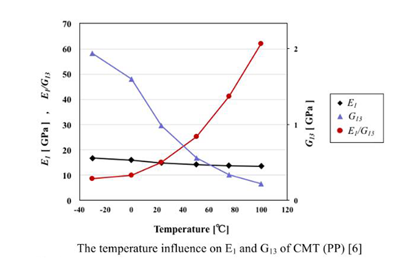 另外在特殊的領(lǐng)域中,還需要考慮到不同溫度下的性能表現(xiàn),那隨著溫度升高,CFRTP的楊氏模量(E1)與切向剪切模量(G13)都會降低,但G13的降低速度更快,因此在高溫情況下,CFRTP產(chǎn)品具備更好的安全系數(shù)。