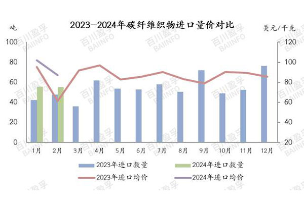 2. 碳纖維織物進(jìn)口在1-2月總計(jì)110.75噸,進(jìn)口來源主要為美國和日本,進(jìn)口量同比有所增加,但進(jìn)口均價(jià)在102.14-87.24美元/千克之間波動(dòng),日本產(chǎn)品價(jià)格高于平均水平。