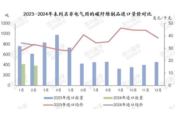 綜合來看,2024年1-2月國內(nèi)碳纖維市場(chǎng)價(jià)格區(qū)間窄幅波動(dòng),但下游需求偏淡,碳纖維產(chǎn)品進(jìn)口貨源同比減少,且主要以進(jìn)口碳纖維為主,其他產(chǎn)品進(jìn)口相對(duì)較少。