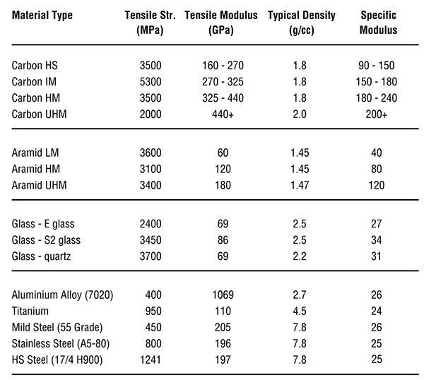 通過下表我們可以了解到最常用增強纖維的基本力學(xué)性能以及常見金屬材料的性能對比。