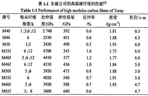 從上圖可知,PAN基高模碳纖維的性能與PAN基高強(qiáng)碳纖維的性能具有一定的差距。從M40到M50碳纖維的拉伸強(qiáng)度略有降低,但彈性模量大大提高;而從M35J到M65J碳纖維的強(qiáng)度雖然也略有降低,但相比于M系列已經(jīng)大大提高了,彈性模量從343GPa增加到640GPa,增長了將近一倍,纖維的直徑也在趨于細(xì)旦化,從6.5μm降低到了4.7μm。T300到T1000G強(qiáng)度提高了近一倍,而模量提高的幅度很小,強(qiáng)度最高的T1000G的模量值也僅達(dá)到了294GPa。